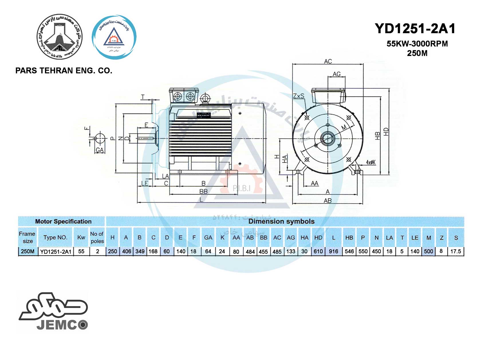 قیمت و کاتالوک تفکیکی شامل DataSheet و Drawing الکتروموتور جمکو سریYD فشارضعیف YD1251-2A1 مدل B35 پایهفلنجدار، قدرت 55(کیلووات) و سرعت 3000(دور در دقیقه).